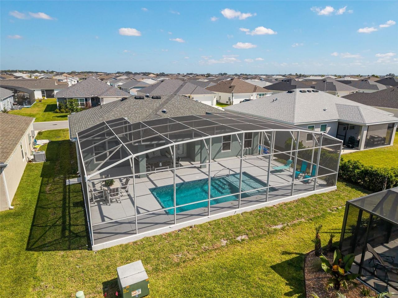 Located in the desirable Village of Shady Brook, near Eastport; this Gilcrest model home has been upgraded to feature a brand new 12'x20' stunning gas-heated pool, set within a white screened lanai complete with decorative fountains and a spacious sundeck for your enjoyment. There is a covered area for shade, as well as a large, uncovered patio, perfect for entertaining large groups. You will walk into the spacious open floor plan of the living room, dining room and eat-in kitchen, equipped with custom lighting and multiple skylights for ample sunlight. The master bedroom features a private tile walk-in shower with glass door and a quartz-top vanity with drawers for storage. The walk-in closet has additional shelves added for maximum organization. The other side of the house features two bedrooms with ample double-door closet space and a guest bathroom with tub/shower combo and tile on the walls. There is a separate laundry room as you head out towards the two-car garage, where you will notice a water softener has been added already for your convenience. The front door keypad has been upgraded for ease of monitoring remotely. Various light fixtures have been upgraded throughout; blinds have been installed, gutters have been added, landscaping updated with a Sylvester palm tree and more! With the right offer, this home conveys fully furnished - including the 75 television, artwork, small appliances, and everyday essentials. Truly move-in ready.The location is unbeatable. Eastport Town Center is just over a mile away, and Sawgrass Grove - with live nightly entertainment, the Show Kitchen, and Villages Grown market - is a short golf cart ride away. Golfers are minutes from both Southern Oaks Championship Golf Course and Laurel Oak Executive Course. Ezell Recreation Center is just up the road, with the growing Middleton area just south.Home was newly constructed in 2024. Public water and sewer. No history of water intrusion, flooding, or insurance claims. Pool enclosure meets all Florida barrier requirements. See the Sellers Disclosure for further details on upgrades. The Villages is a 55+ community. See their website for details regarding occupancy and restrictions.